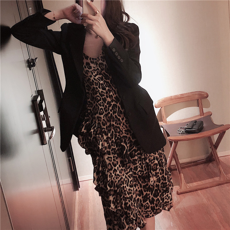/ 連衣裙秋2018新款女裝韓版荷葉邊打底豹紋裙子氣質V領吊帶中長裙