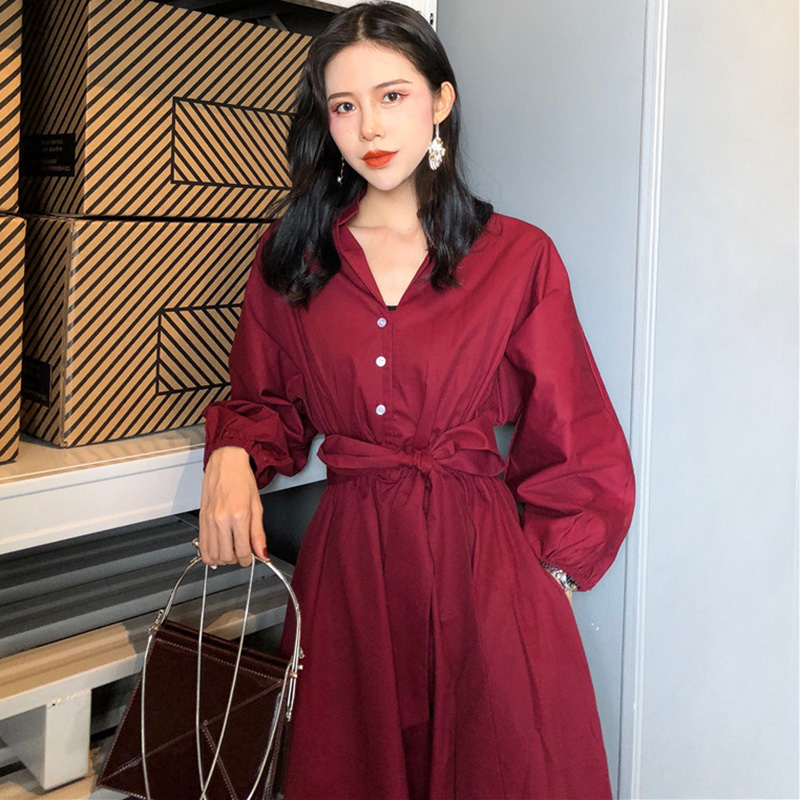女秋裝新款復古高腰顯瘦綁帶泡泡長袖連衣裙氣質紅色a字中長裙子