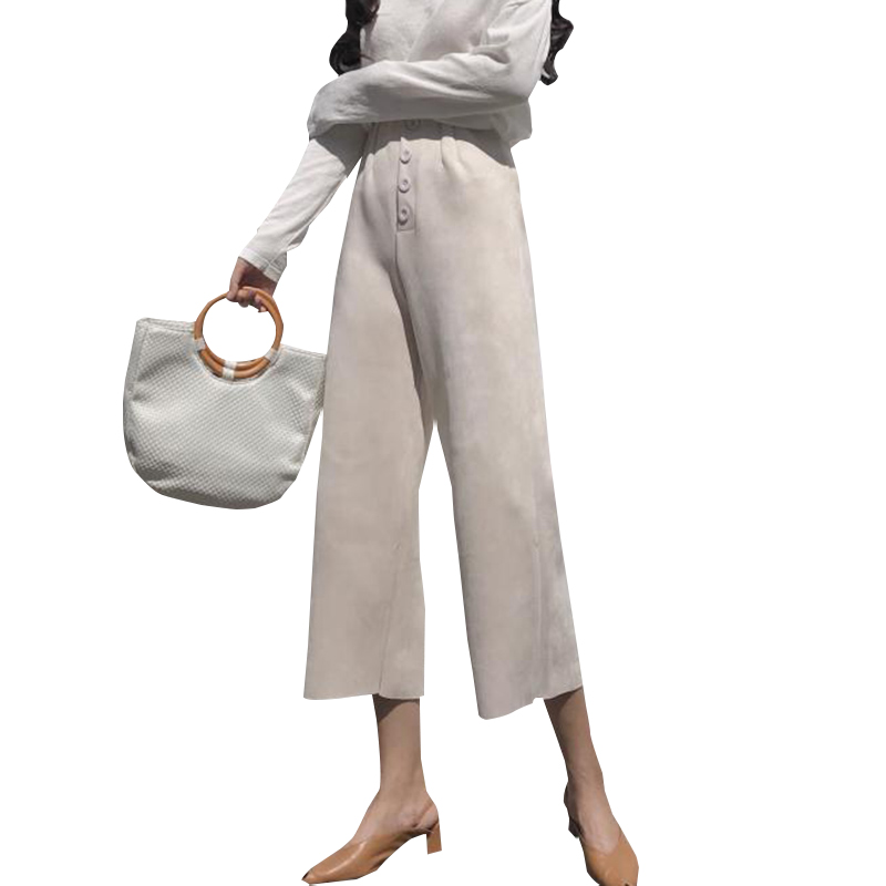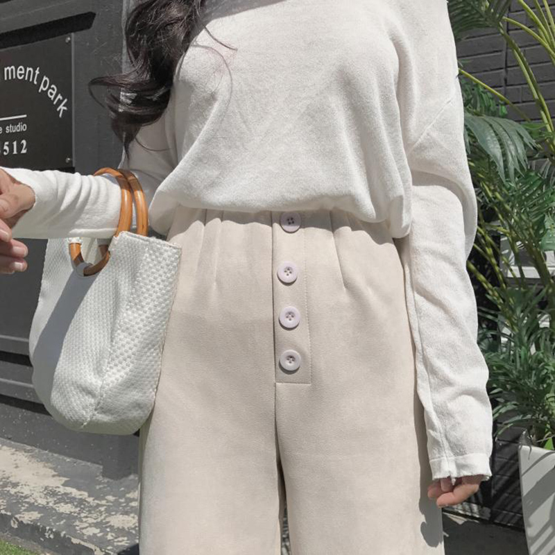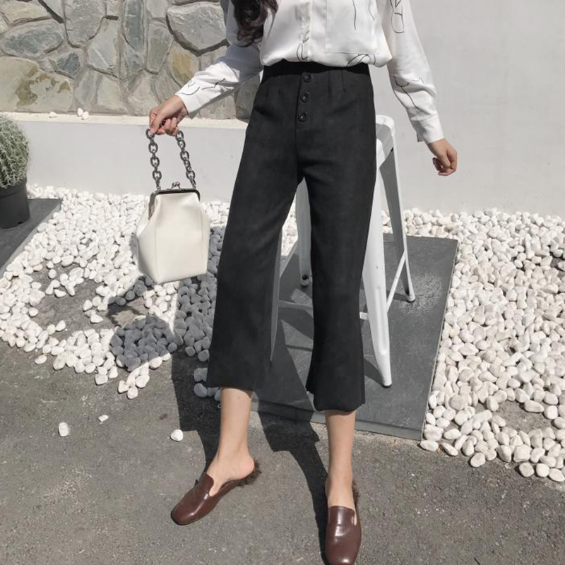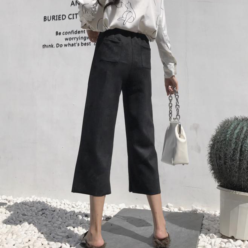 / 秋裝女新款港味氣質麂皮絨闊腿褲高腰休閑九分褲時尚黑色直筒褲子