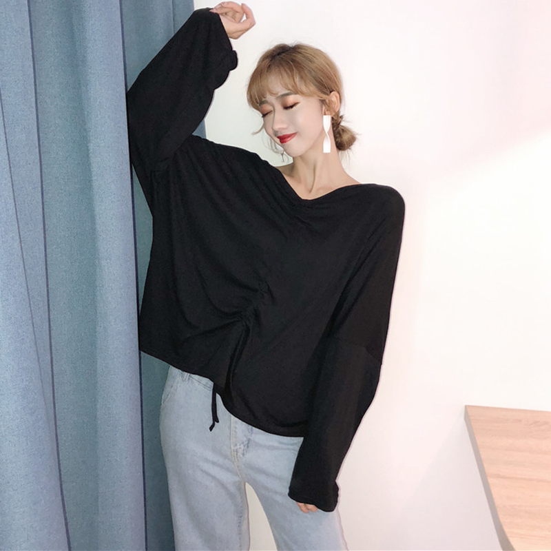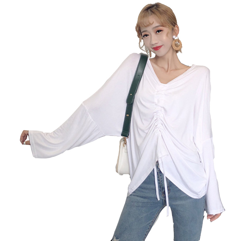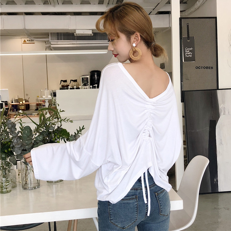 上衣女早秋2018新款韓版女裝寬松抽繩褶皺V領長袖露背T恤白色罩衫