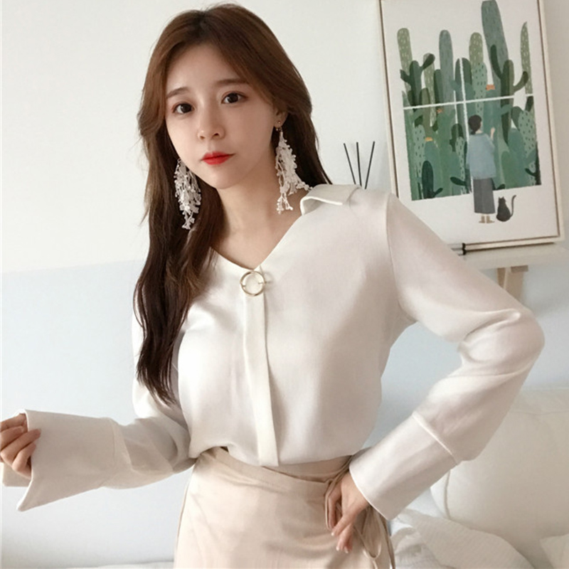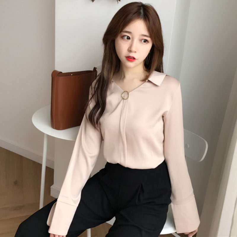 初秋新款韓版女裝港味復古氣質V領長袖雪紡襯衫少女純色百搭上衣