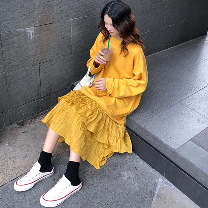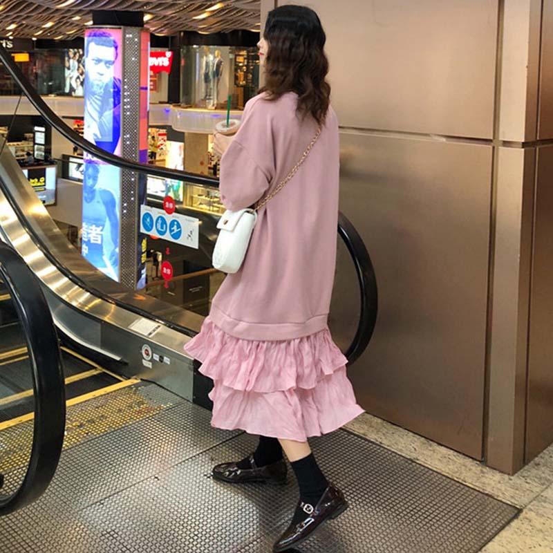 荷葉邊連衣裙秋裝女2018新款韓版壓褶拼接衛衣裙時尚休閑中長裙子