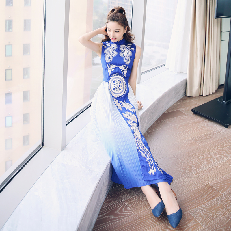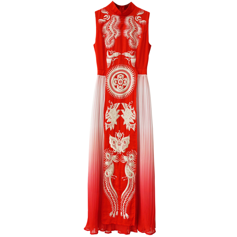 / 通勤復古2018春繡花拼接不對稱荷葉邊裙女立領無袖收腰顯瘦連衣裙
