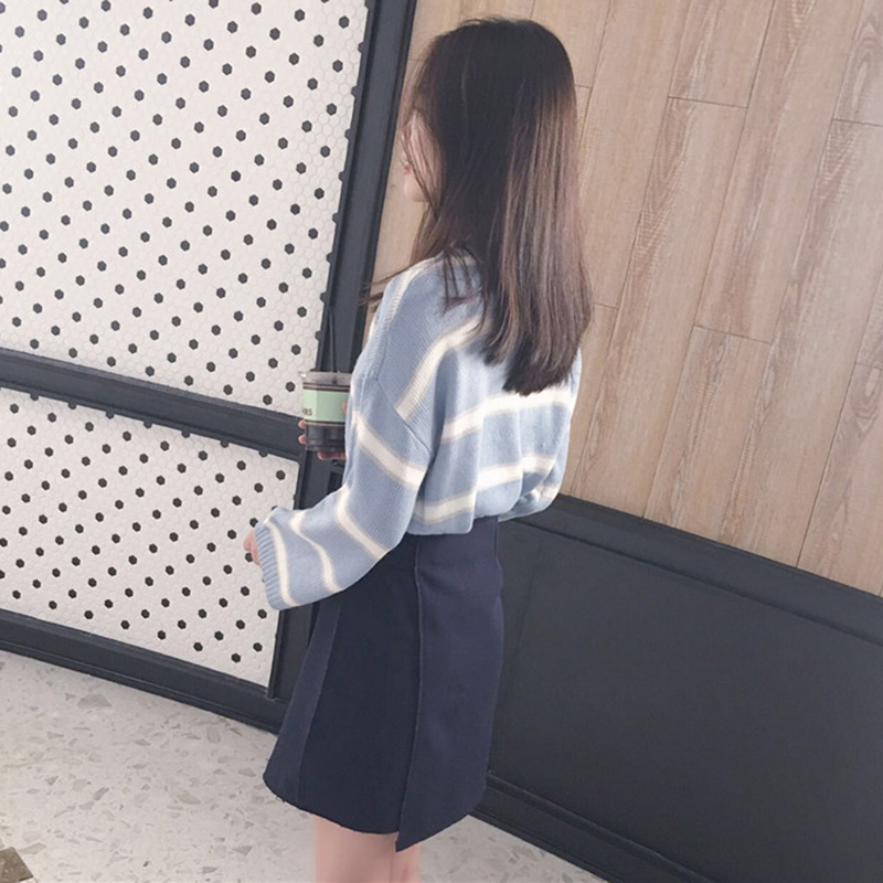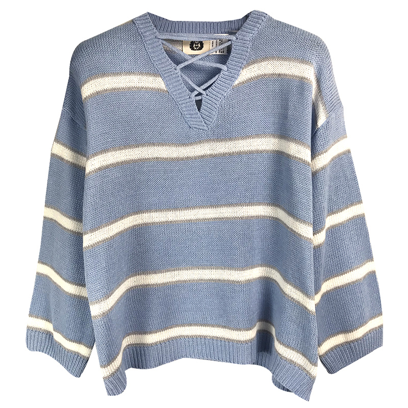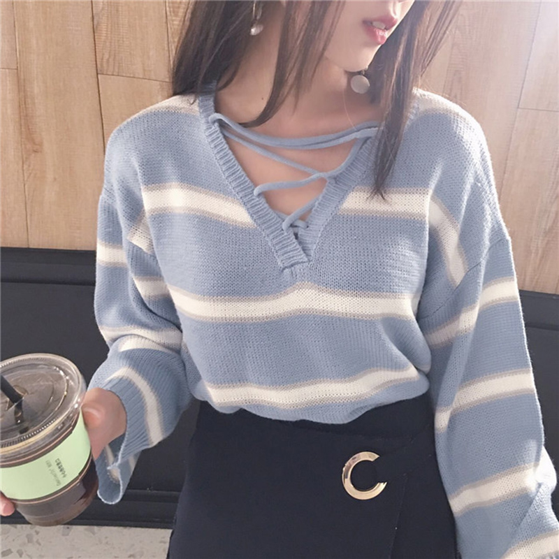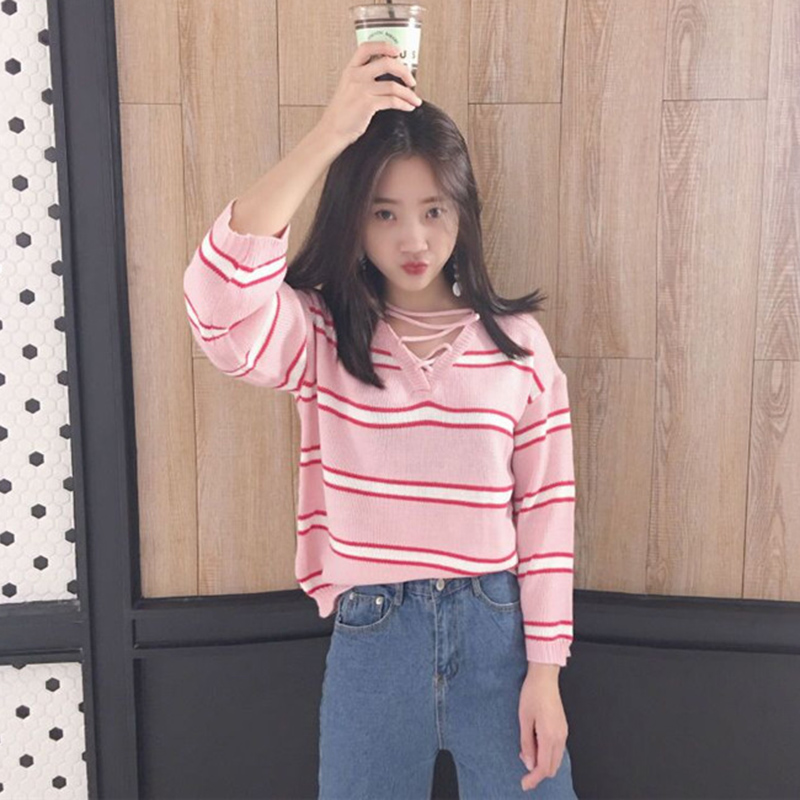/ 秋季女裝新款韓版寬松交叉V領套頭衣服學生清新條紋長袖針織毛衣