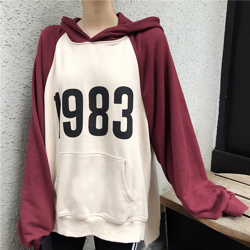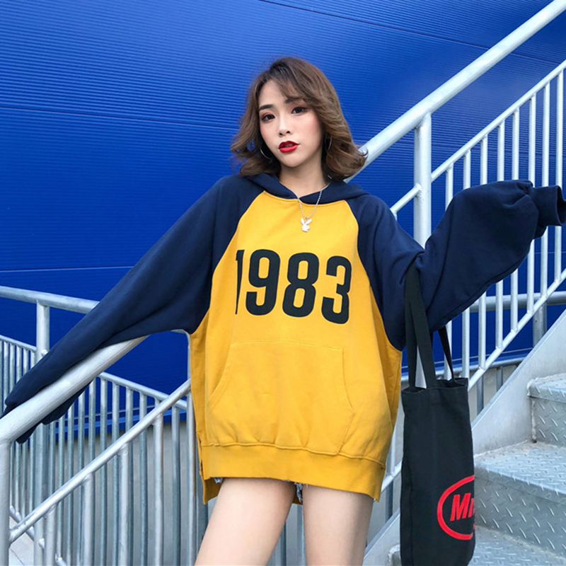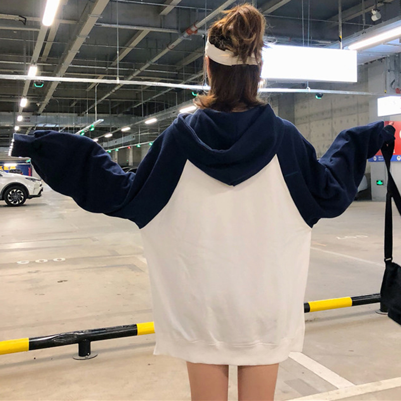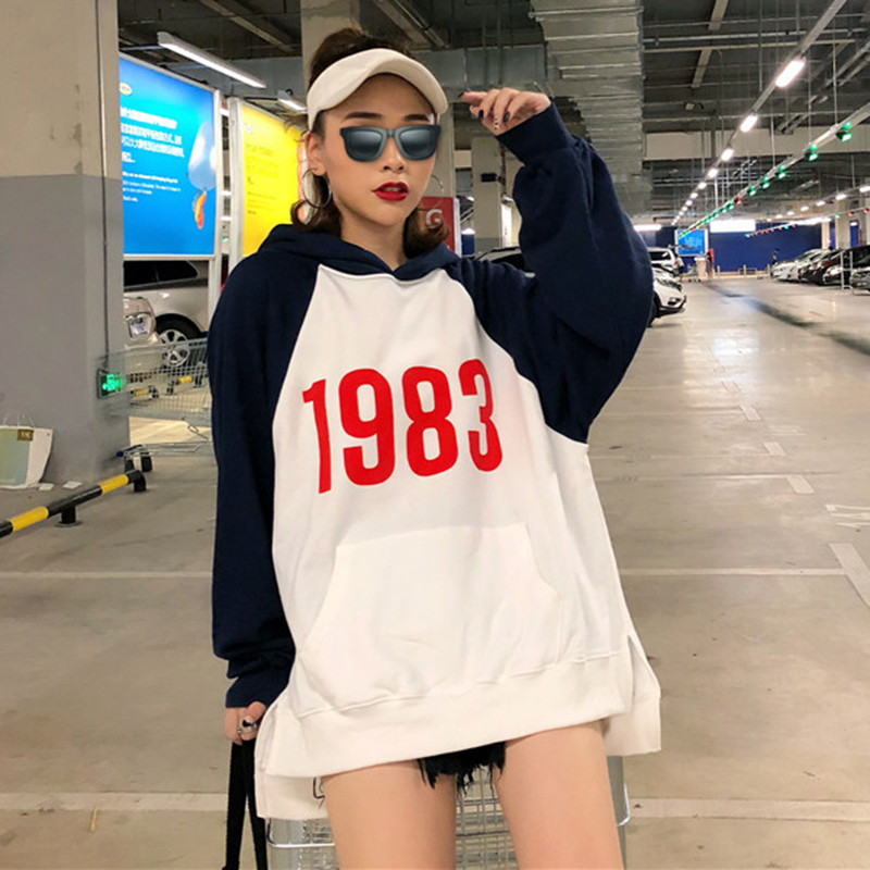 2018女秋裝新款韓版學生寬松開叉印花連帽衛衣慵懶拼色長袖上衣潮