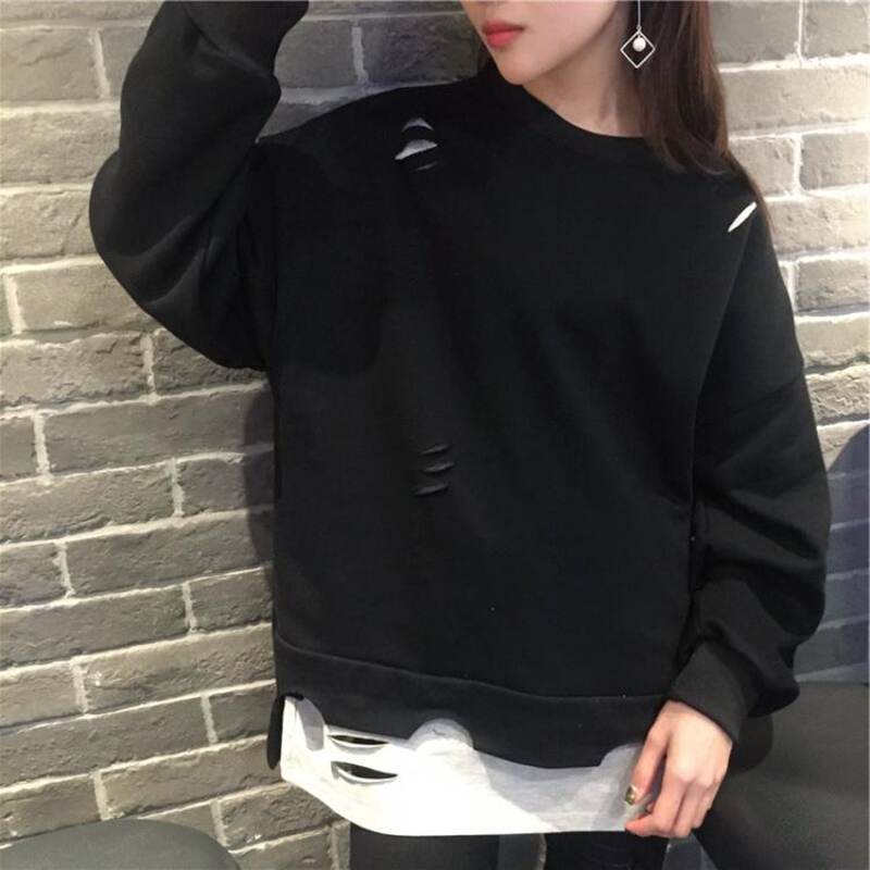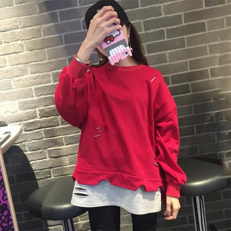 / 不規則破洞長袖假兩件上衣早秋新款韓版女裝學生寬松黑色衛衣外套