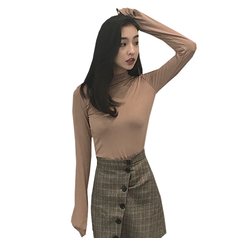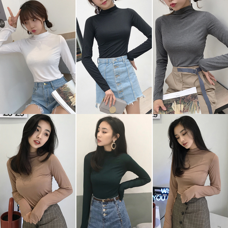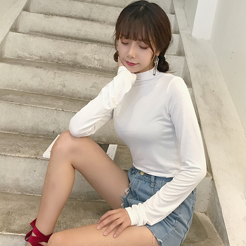 早秋2018新款女裝韓版修身顯瘦半高領長袖白T恤百搭緊身打底上衣