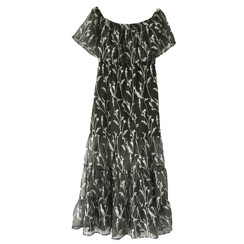 S秀淑女氣質2018夏季新款短袖一字領大花荷葉邊鏤空繡花連衣裙潮