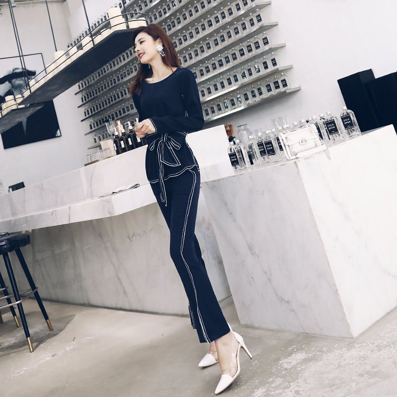/ 歐洲站網紅洋氣港味復古闊腿褲長袖上衣兩件套時尚套裝女2018初秋