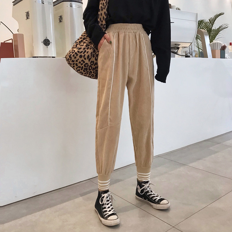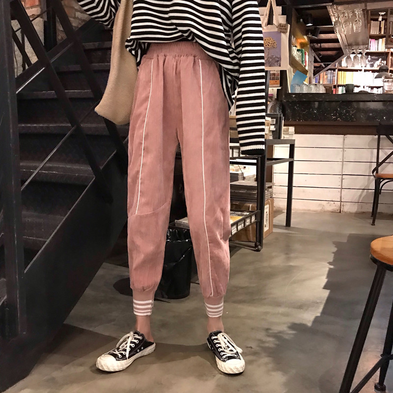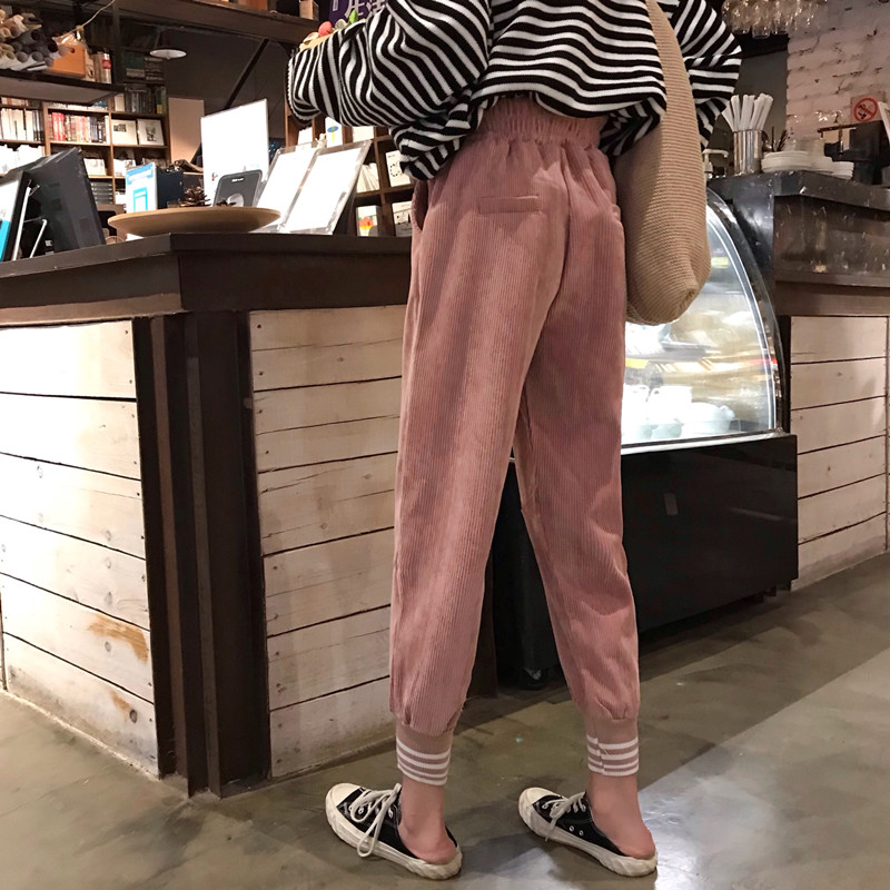 / 長褲子女秋冬裝新款韓版寬松條紋燈芯絨學生哈倫褲高腰休閑小腳褲