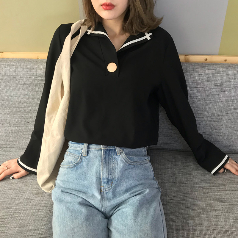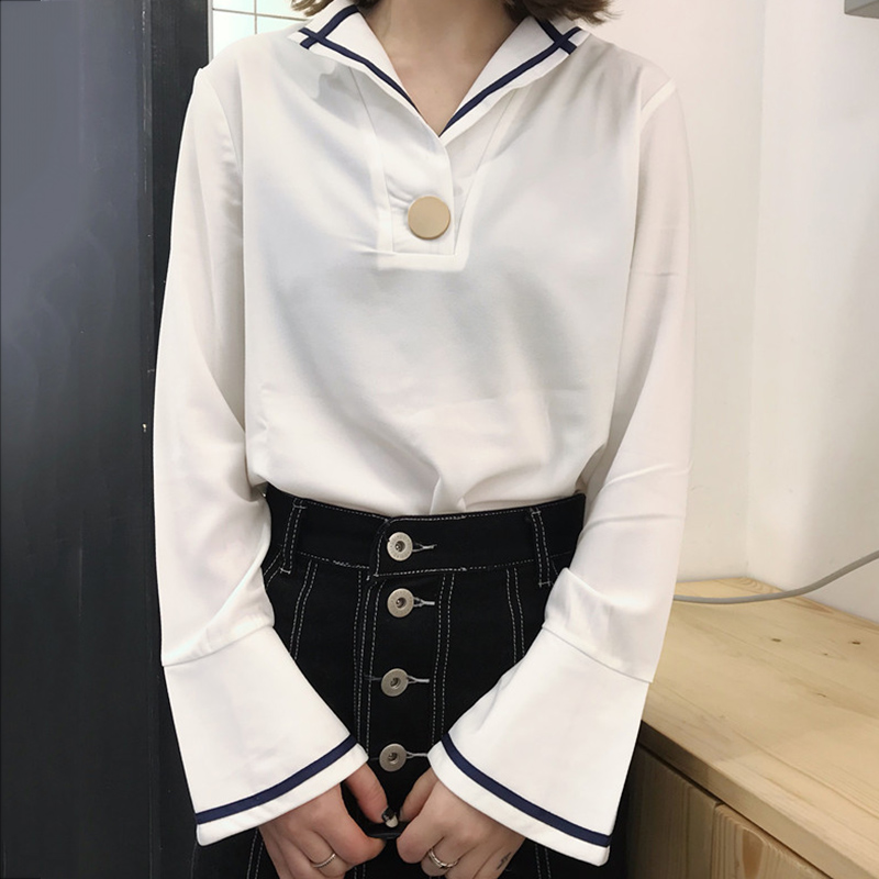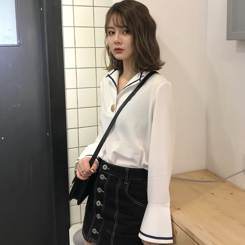 / 秋季女裝韓版條紋拼接開叉喇叭袖氣質襯衫學生長袖休閑襯衣上衣潮