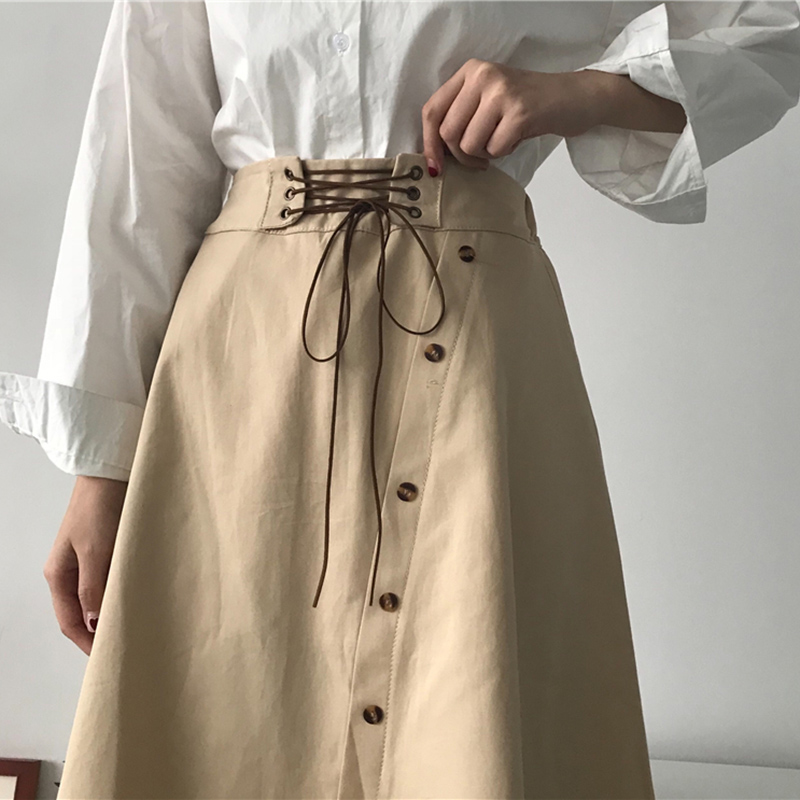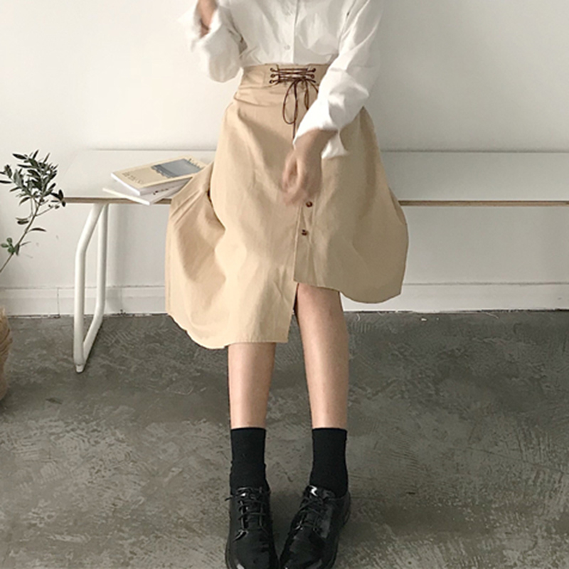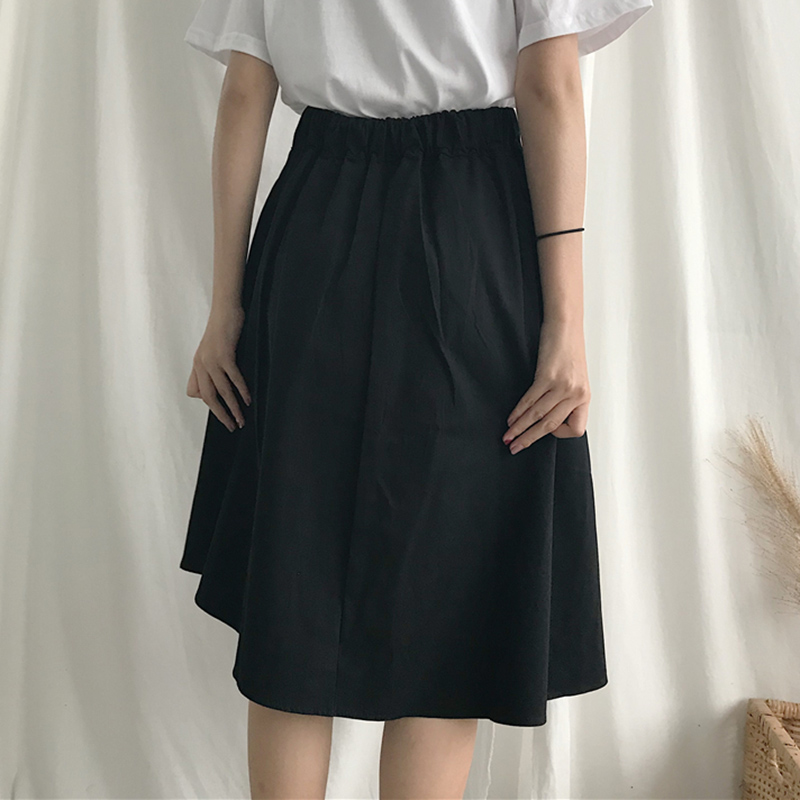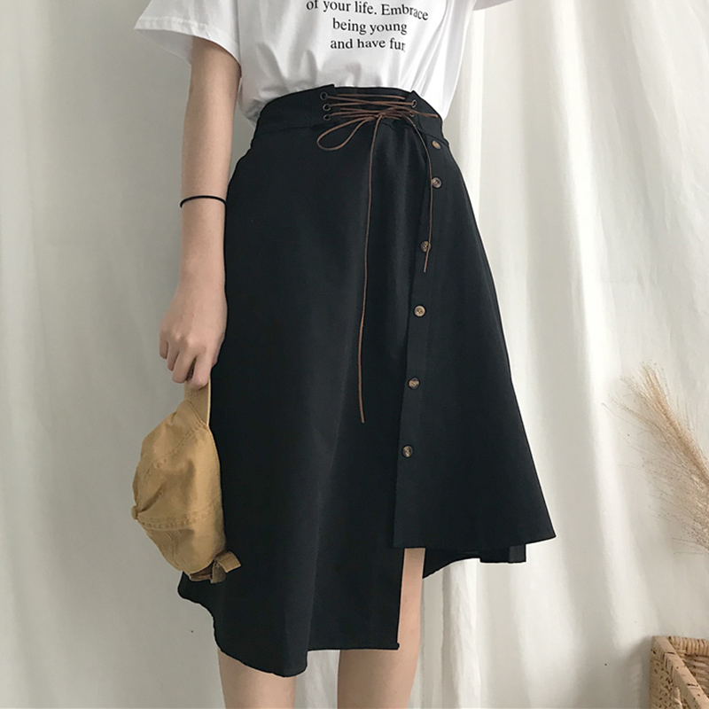 / 秋裝女2018新款復古氣質高腰綁帶不規則半身裙學生休閑a字黑裙子
