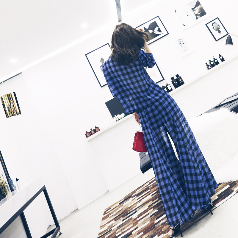 S秀淑女氣質2018夏季新款格子闊腿九分褲子套裝收腰顯瘦潮