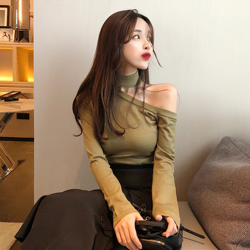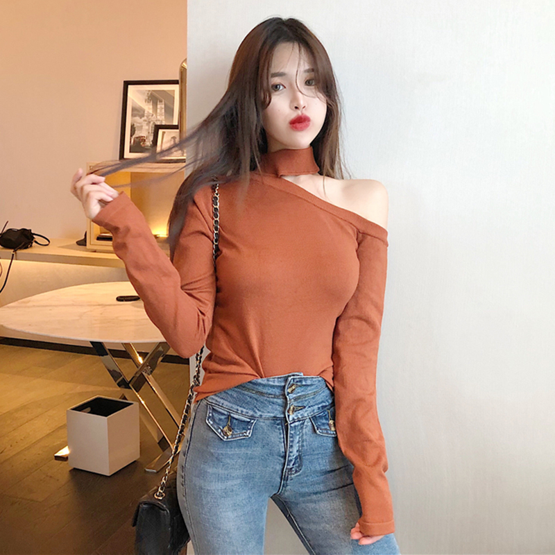 復古秋裝新款上衣女裝韓版修身顯瘦氣質chic露肩長袖打底針織衫潮