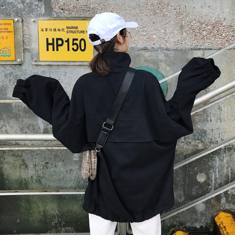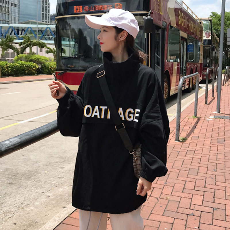 秋裝女新款韓版學生泡泡長袖印花衛衣寬松立領上衣帥氣中長外套潮
