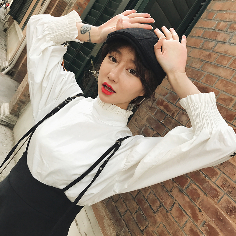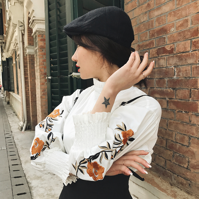學生百搭襯衣女秋裝新款韓版寬松刺繡燈籠袖上衣木耳邊立領白襯衫