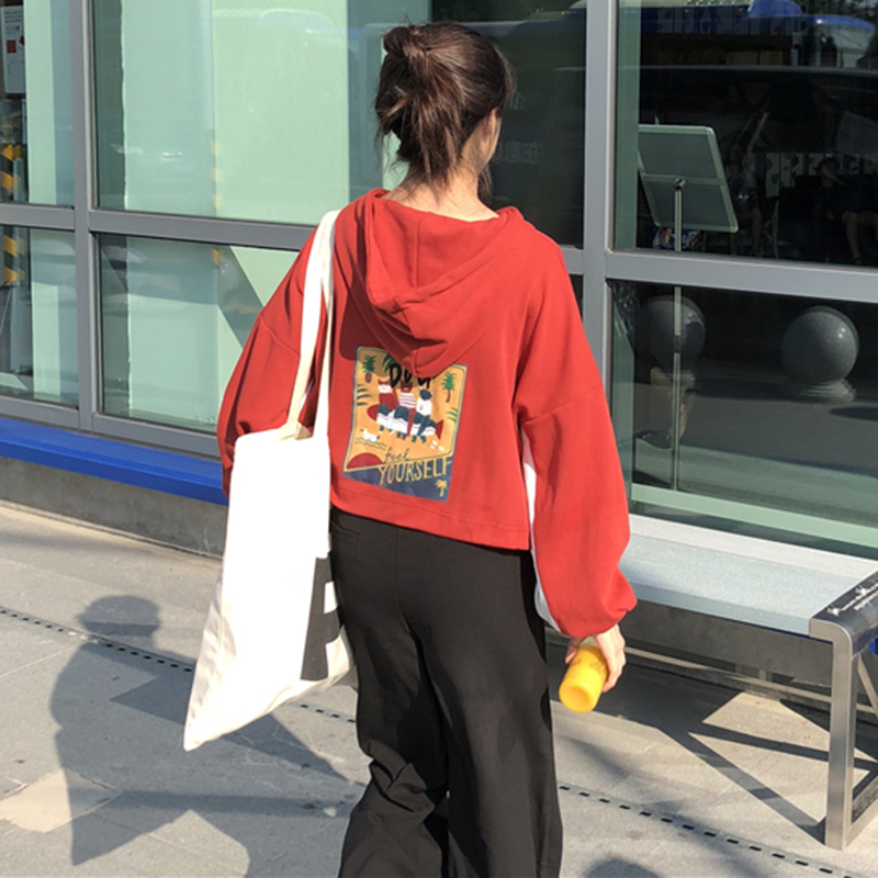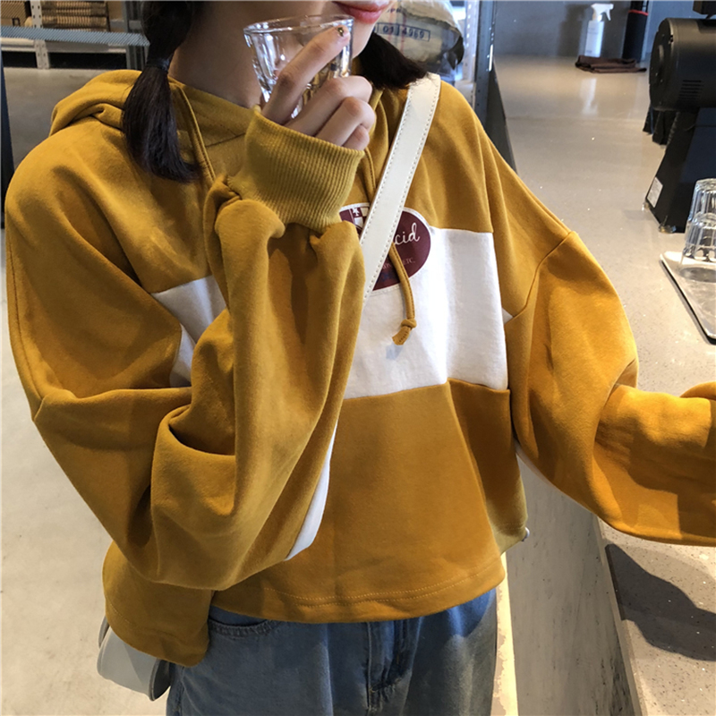 / 秋季新款女裝韓版拼色卡通印花休閑短款連帽衛衣學生寬松長袖上衣