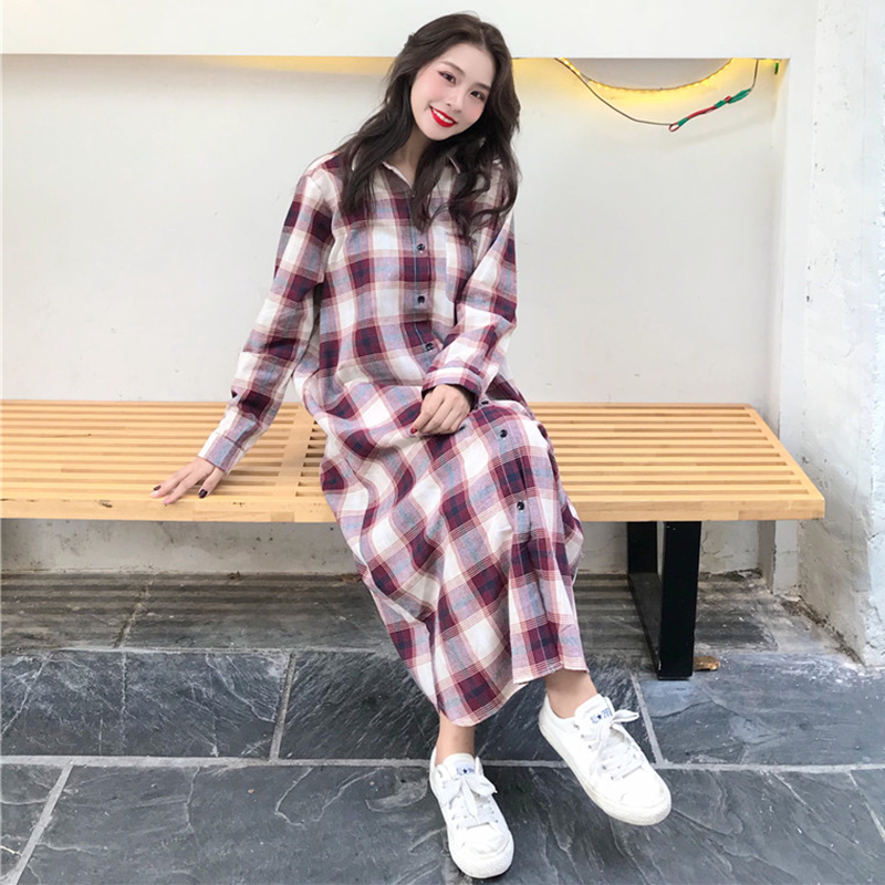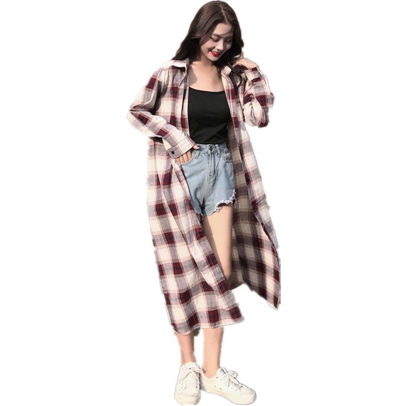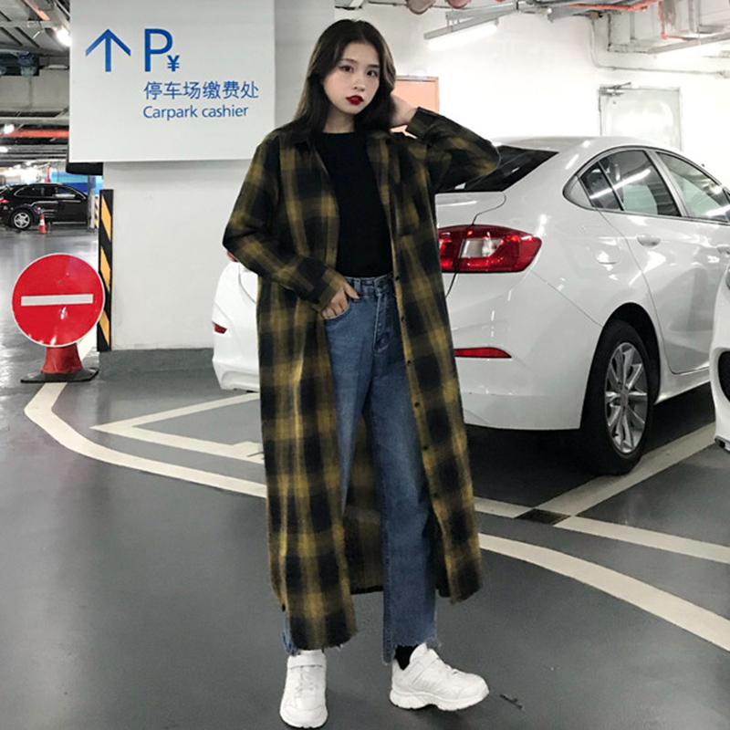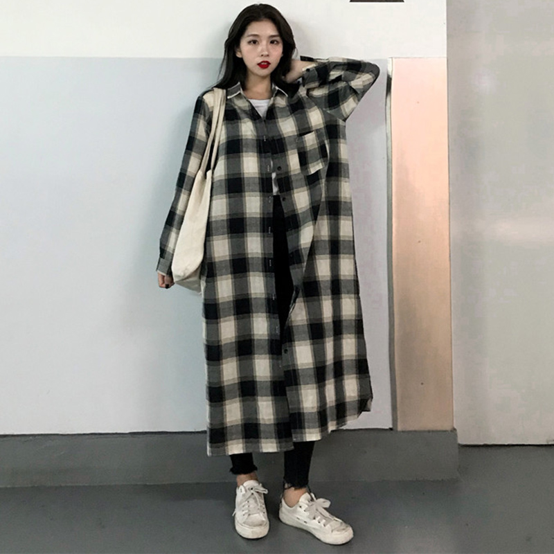/ 早秋新款女裝復古寬松顯瘦過膝中長格子襯衫女生長袖防曬外套開衫