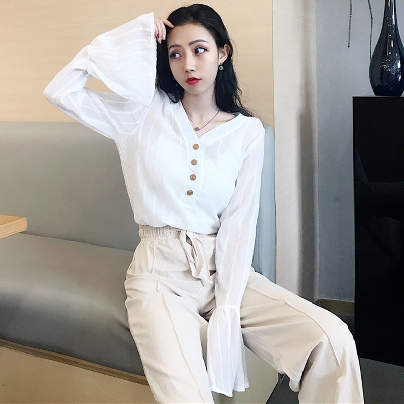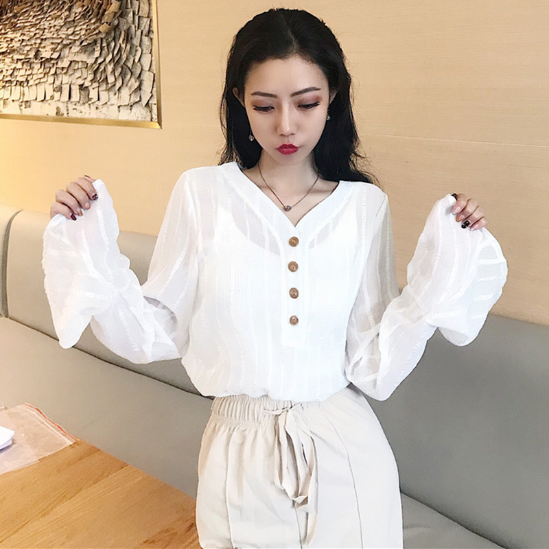 / 早秋新款韓版女裝修身排扣V領喇叭長袖仙氣質雪紡白襯衫顯瘦上衣