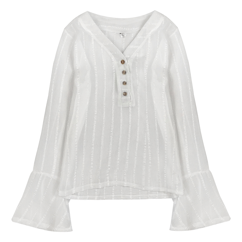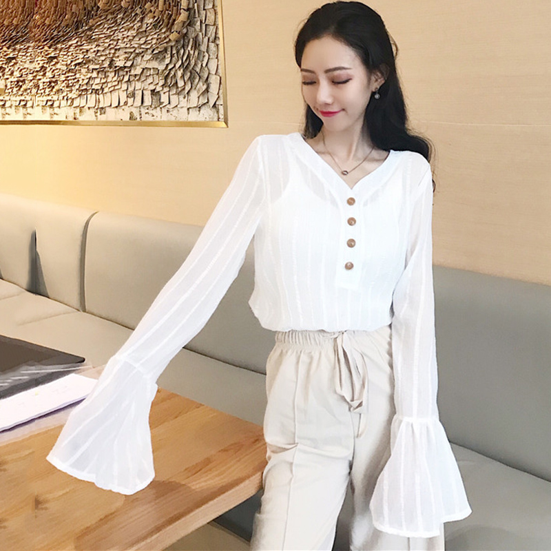 早秋新款韓版女裝修身排扣V領喇叭長袖仙氣質雪紡白襯衫顯瘦上衣