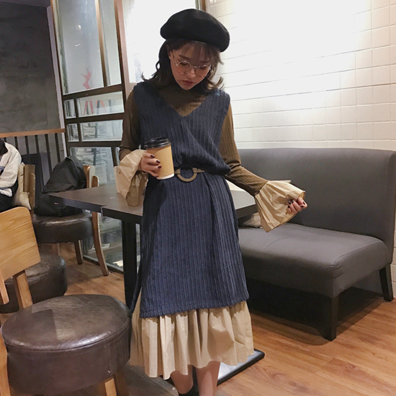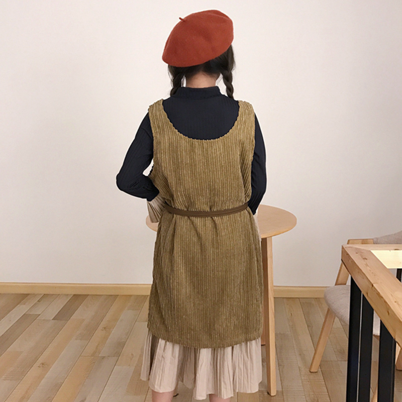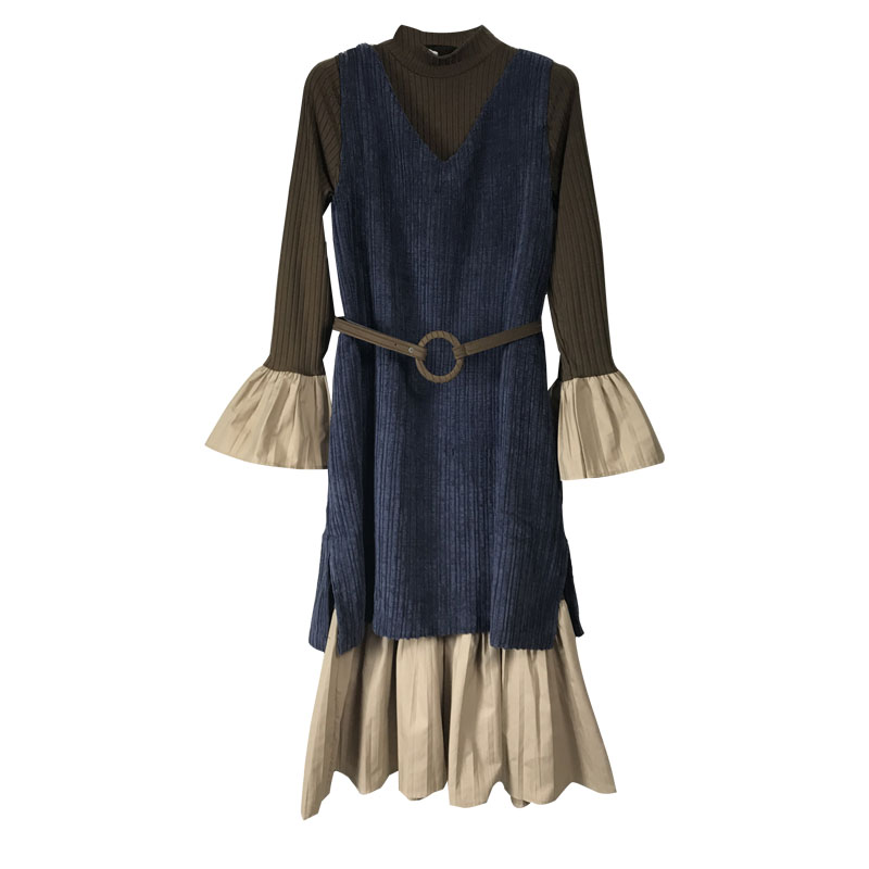 / 套裝女秋新款韓版學生百褶連衣裙喇叭袖中長裙燈芯絨開叉背心裙子