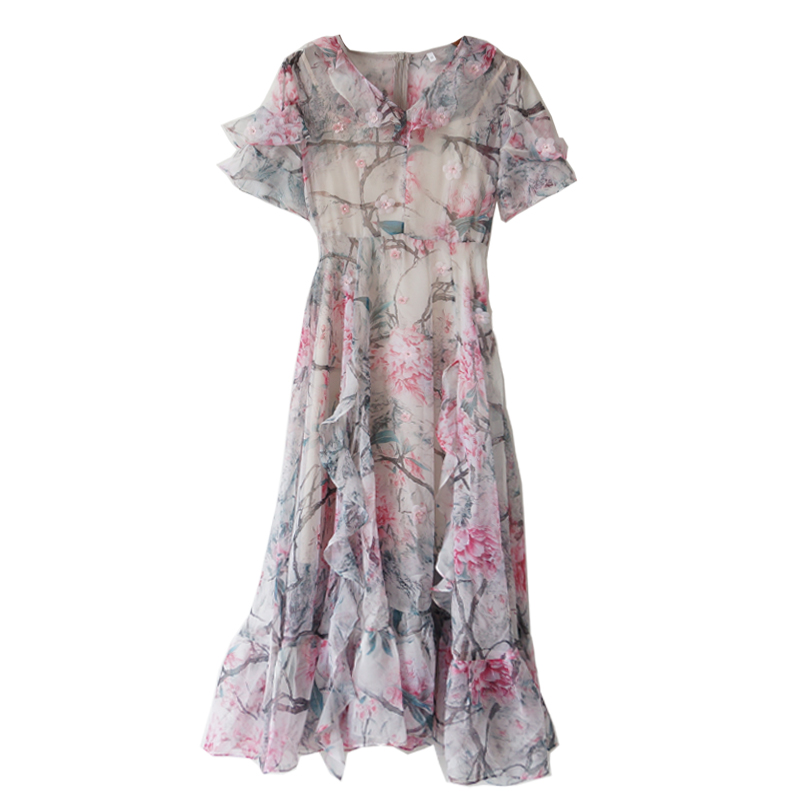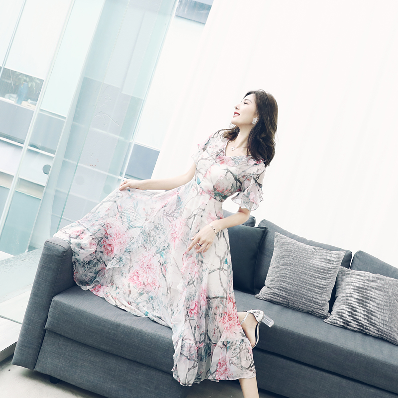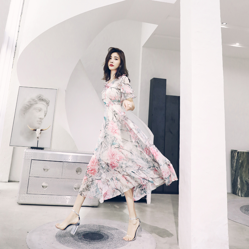 s秀名媛氣質2018夏季新品短袖收腰顯瘦印花女神范碎花長款連衣裙