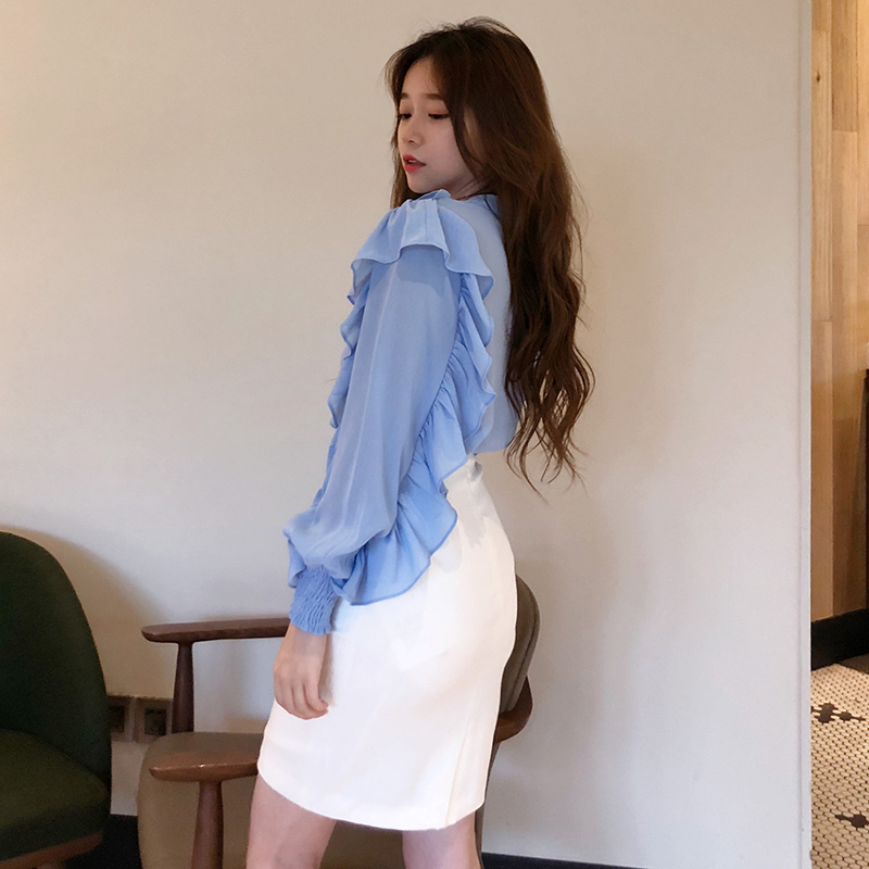 秋裝女2018新款韓版氣質小清新荷葉邊白襯衫休閑系帶泡泡長袖上衣