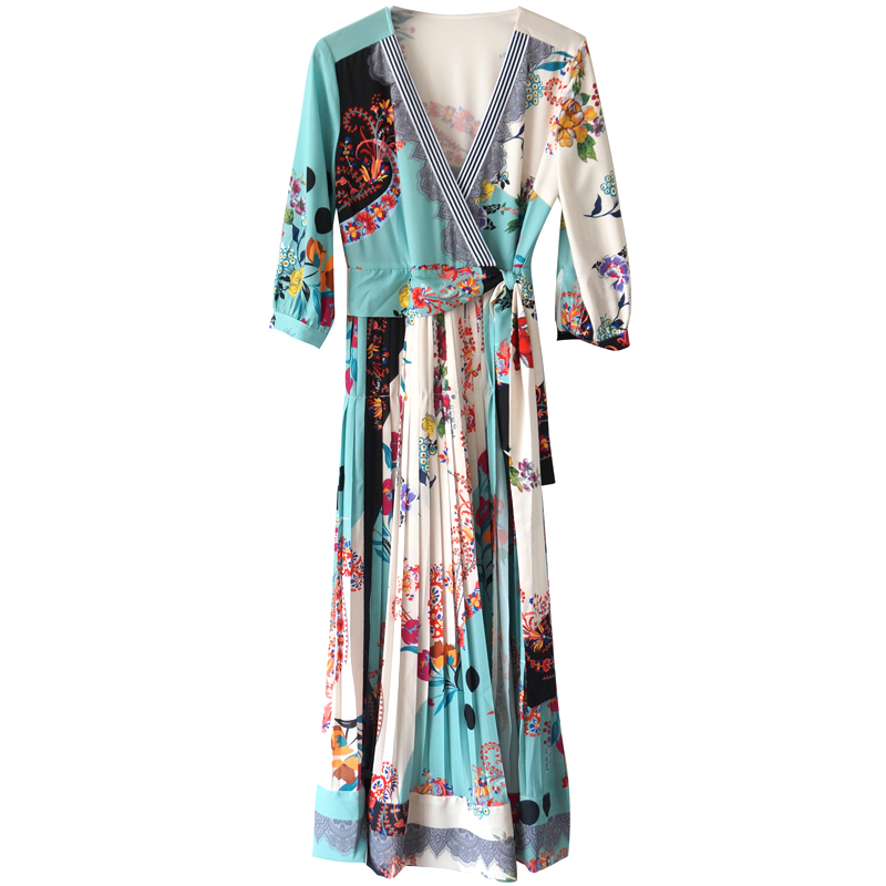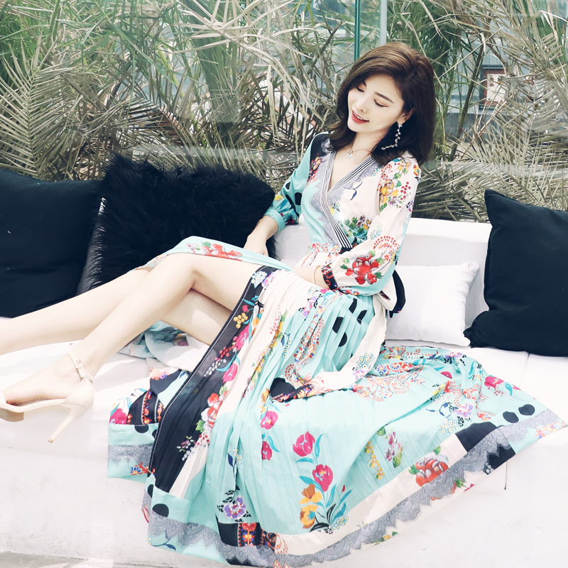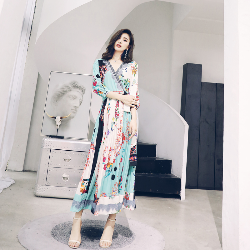S秀淑女氣質拼接印花波浪連衣裙女2018夏季新款V領五分袖荷葉邊裙