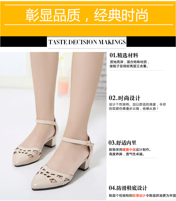 涼鞋女夏季鏤空透氣尖頭粗跟包頭新款中跟一字扣帶高跟女鞋夏