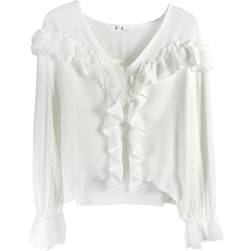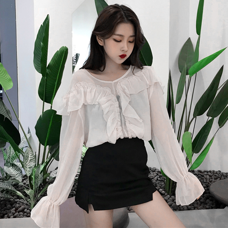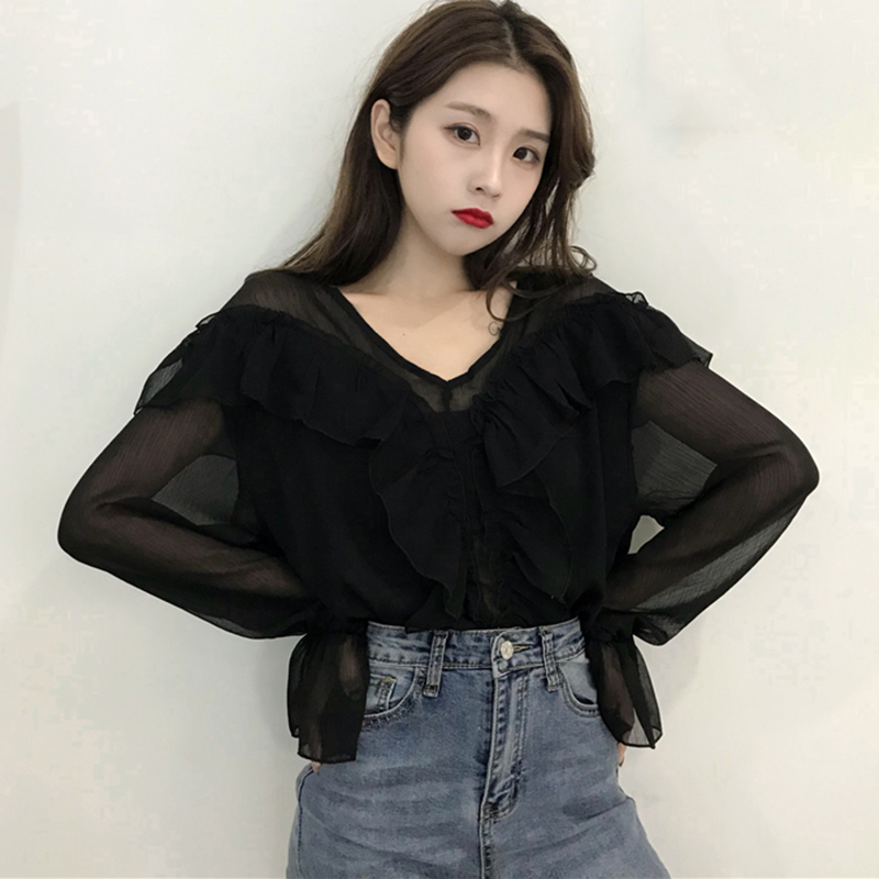 / 早秋2018新款女韓版黑色氣質荷葉邊V領防曬衫寬松燈籠袖雪紡上衣