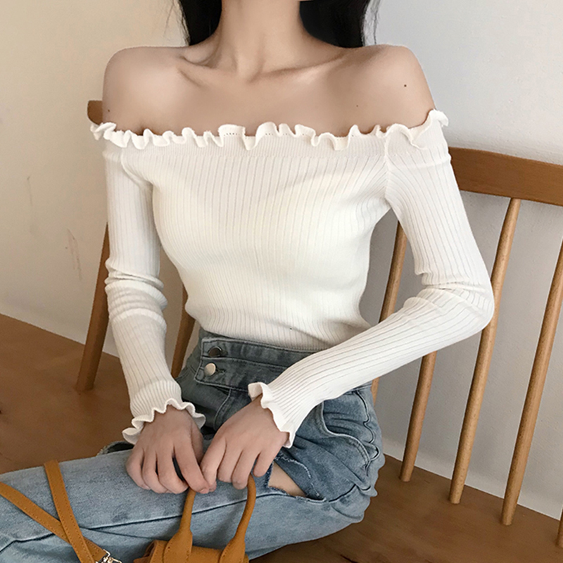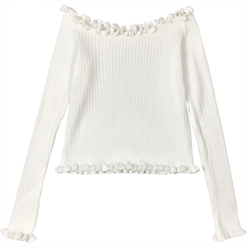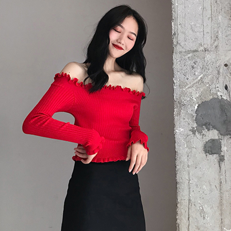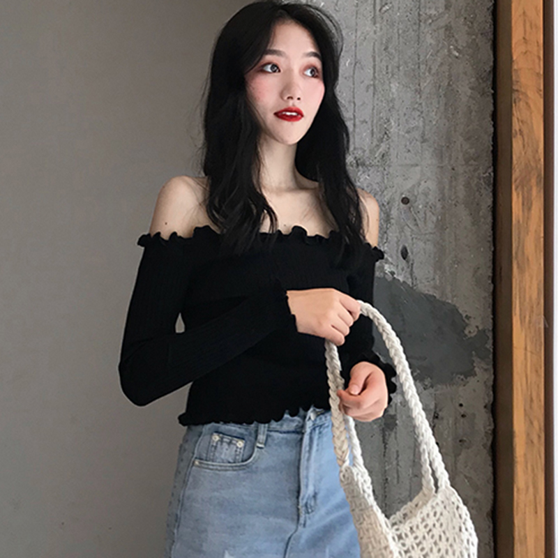 / 黑色打底上衣秋裝女2018新款氣質修身木耳邊一字領露肩長袖針織衫