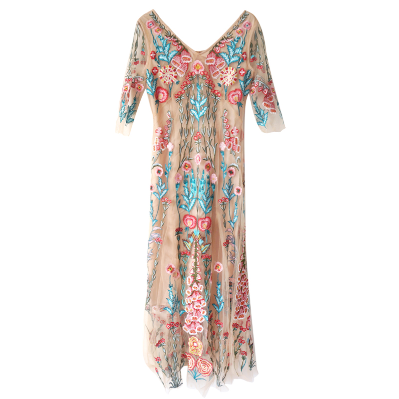 s秀2018新款女裝名媛氣質V領網紗刺繡超仙連衣裙長裙修身顯瘦潮