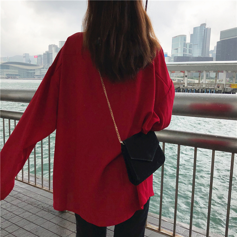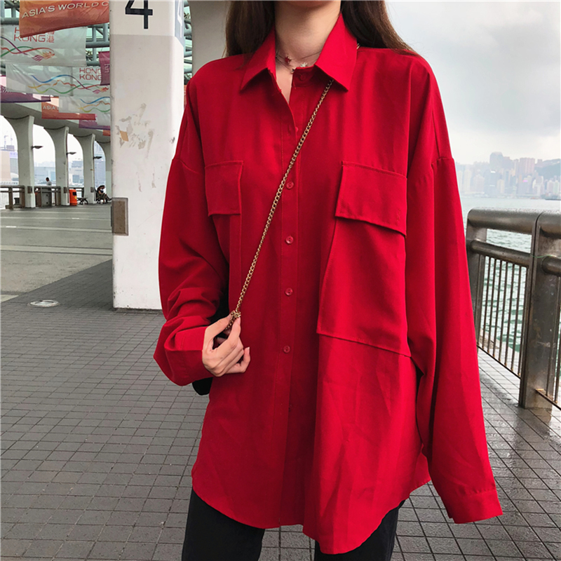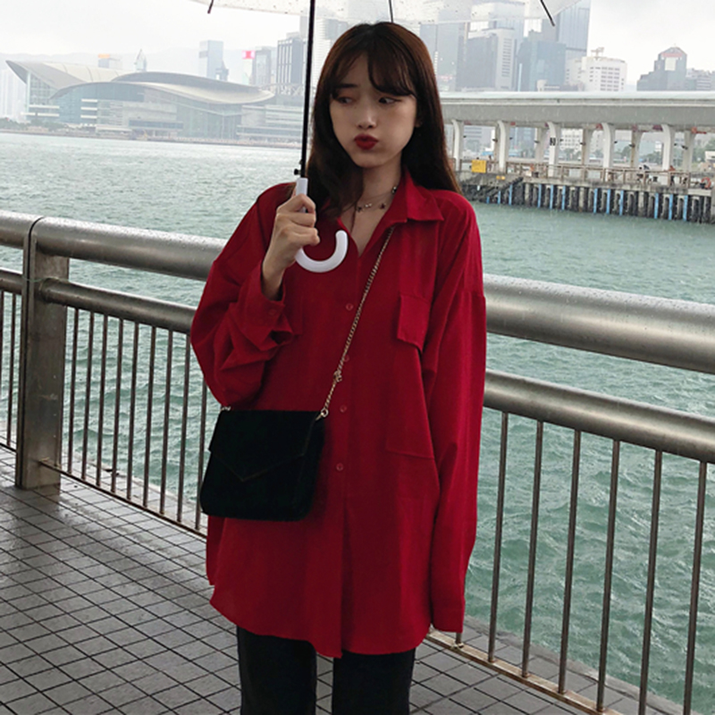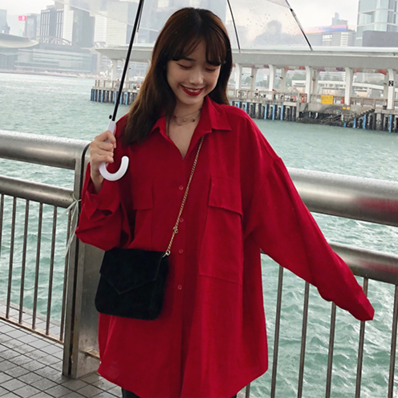 休閑上衣女秋季2018新款韓版女裝寬松長袖中長款紅色襯衫學生襯衣