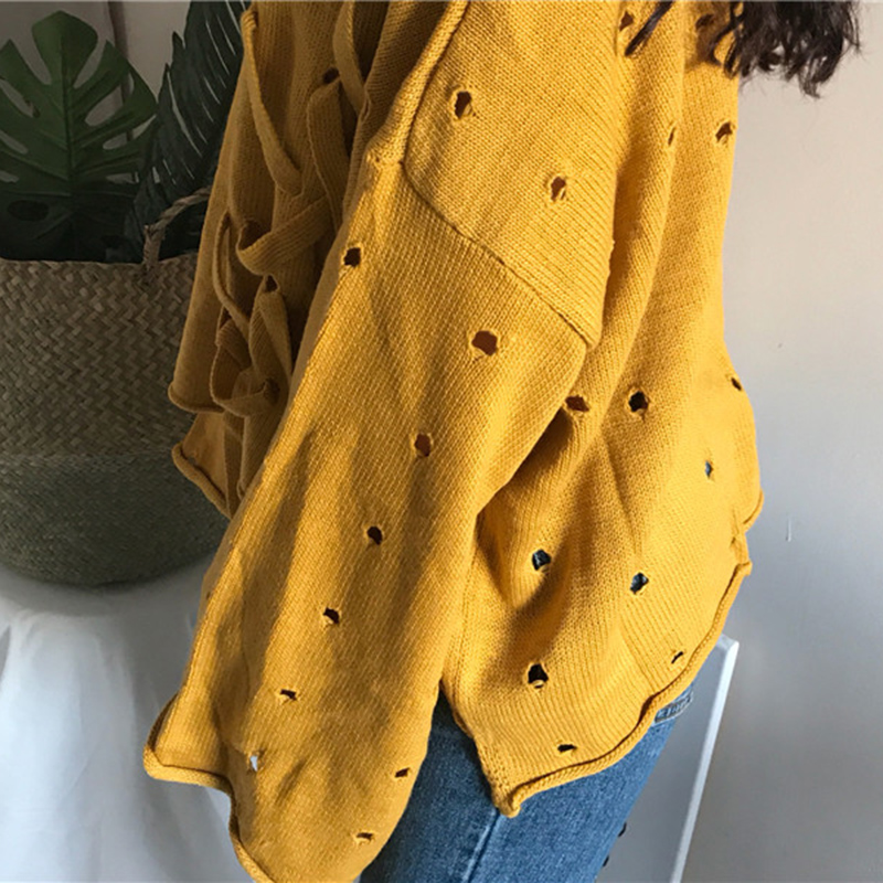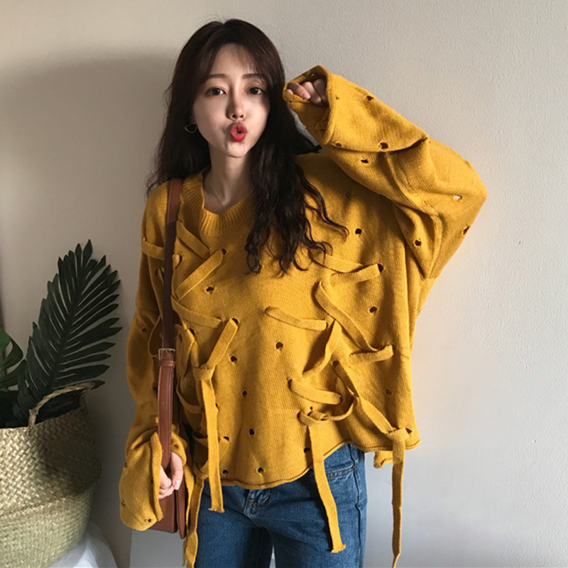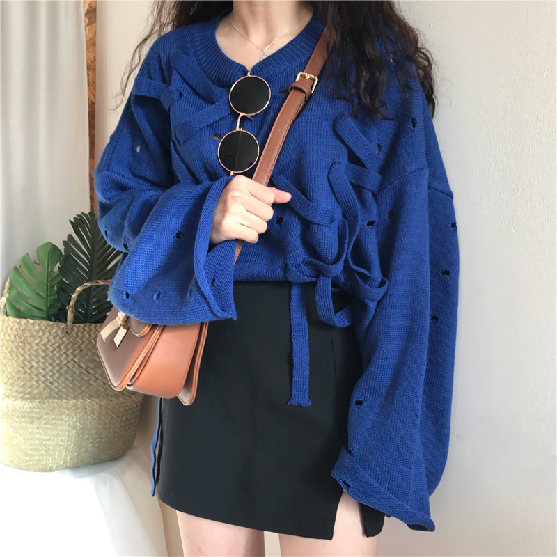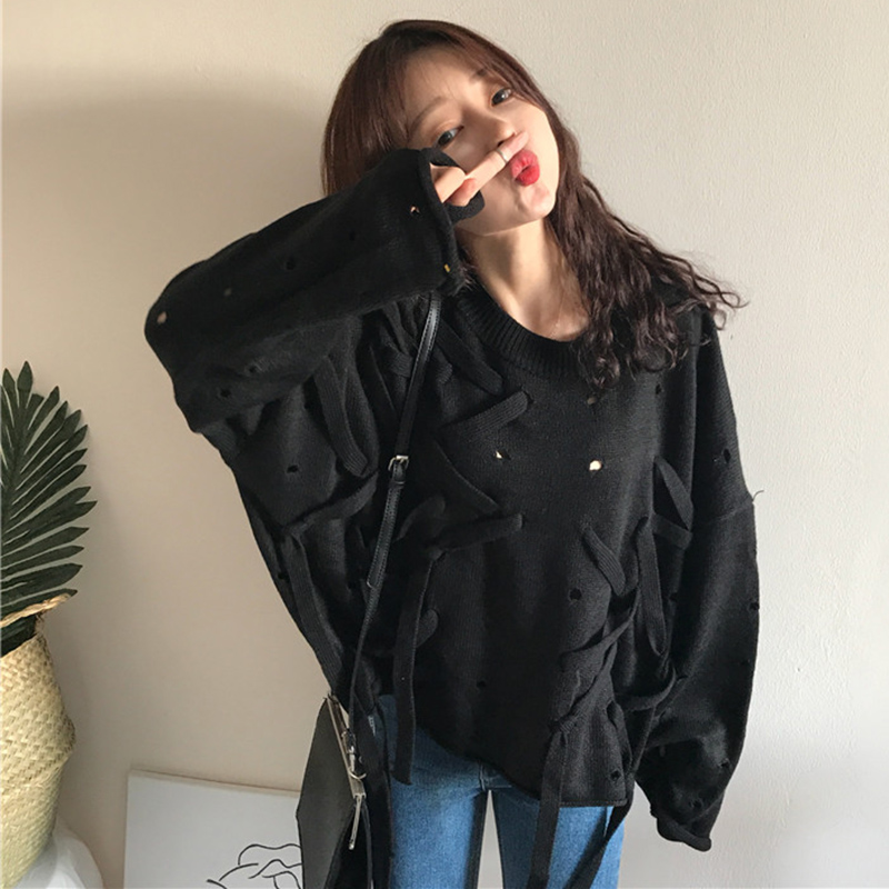 / 秋裝女新款韓版個性破洞穿繩圓領毛衣學生時尚不規則黑色長袖上衣