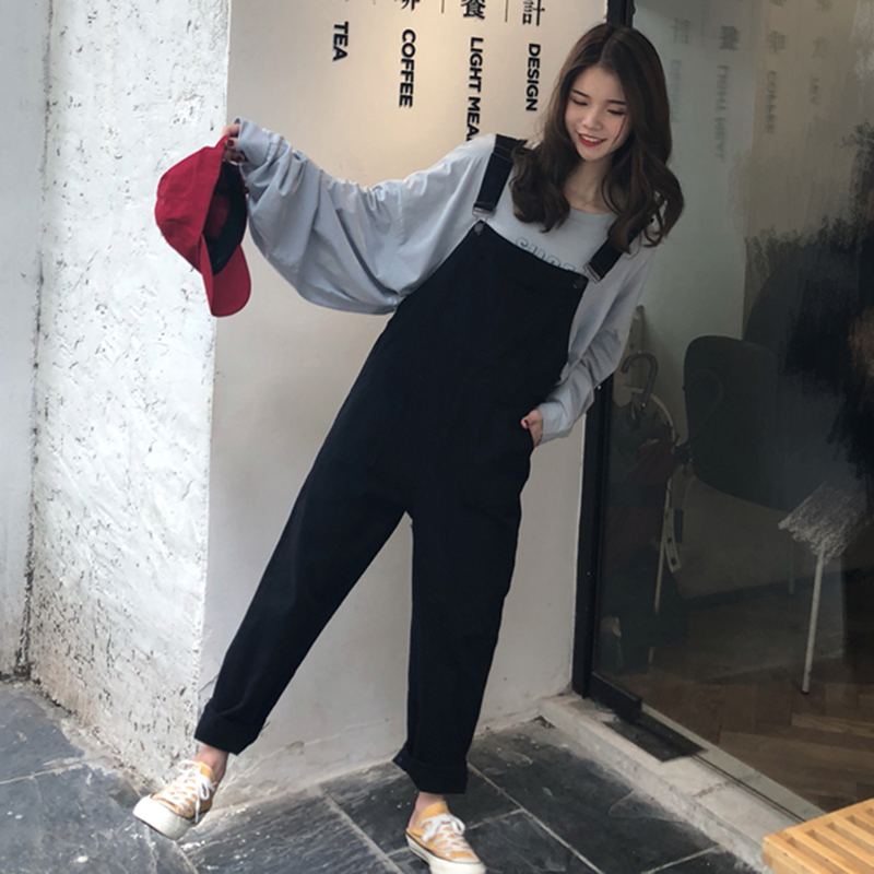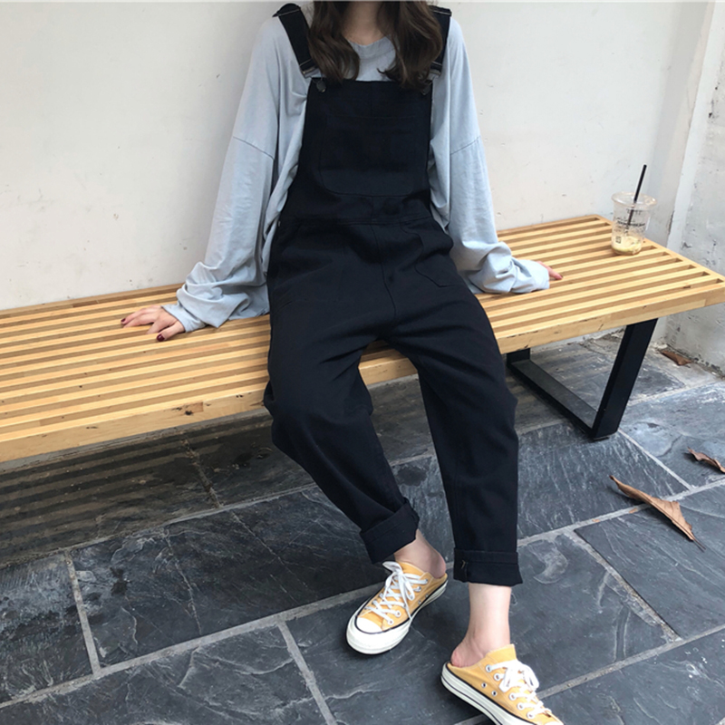 女秋裝新款復古做舊口袋牛仔背帶褲學生寬松顯瘦黑色吊帶連體褲子