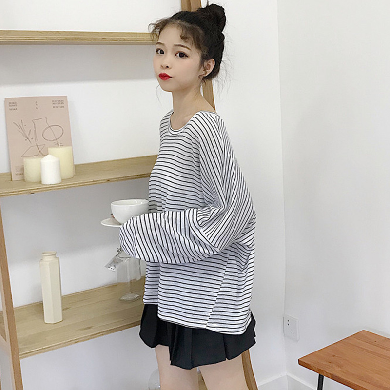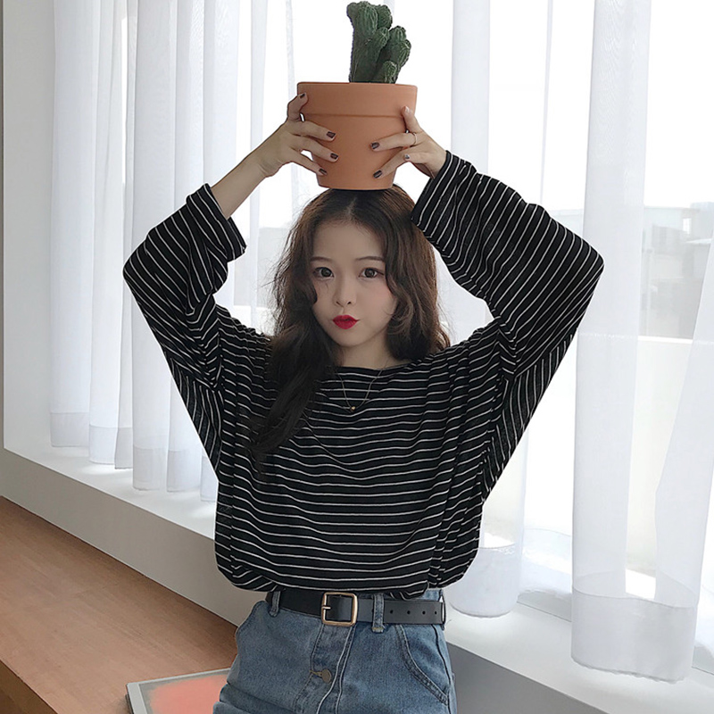 / 早秋新款韓版學院風寬松百搭長袖條紋t恤學生休閑顯瘦打底上衣女